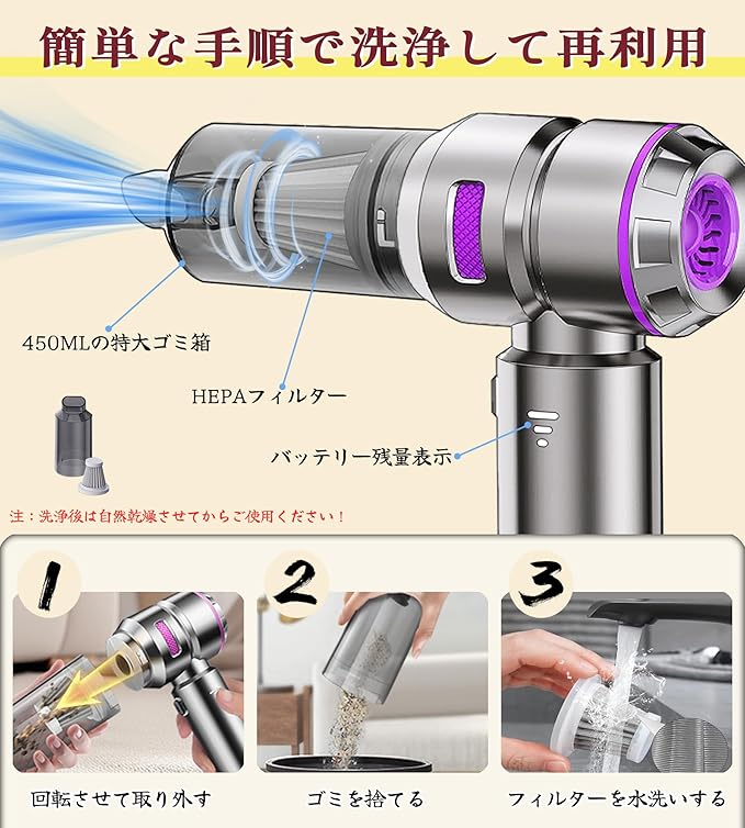 弊社は約束する:"市販されている低価格のハンディ掃除機は、基本的に風力が弱く、バッテリー容量も少ない。他社は偽りの性能表示にこだわっています"。 弊社では、日本のモーターの博士生監修を多数招いてこの製品を開発しました。 従来の低消費電力フーバーから多くの経験を学びました。 これは、弊社が開発した最新の強力ハンディクリーナーです。