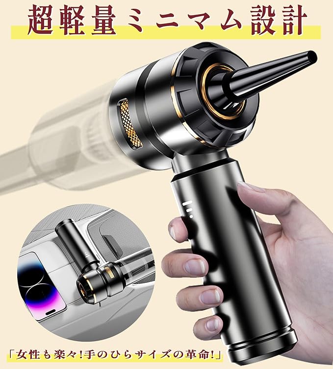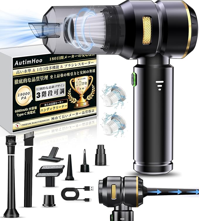 【2025x雑誌掲載】ハンディクリーナー 車用掃除機 1台3役多機能 AUTIMHOO『コードレス/充電式/軽量設計/19000PA強力な吸引力』小型掃除機 3段階可調 パワフルブラシレスモーター コンパクト 高い水準 長時間稼働、ご家庭のホコリ取り・PC/キーボード・車の内装掃除・ペット毛の掃除に最適「黒金・日本で新開発」
