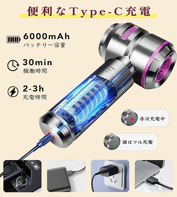 ✅【6000mAh業界最大容量バッテリー】改良型DCトルクモーター搭載で吸引効率200%向上。また、ハンディクリーナー内部の独自の静音設計により「キーン」という不快音を低減。Type-C充電で約2時間のフル充電により、最大30分間の連続使用が可能。車内全体の掃除を一度の充電で完了できます。