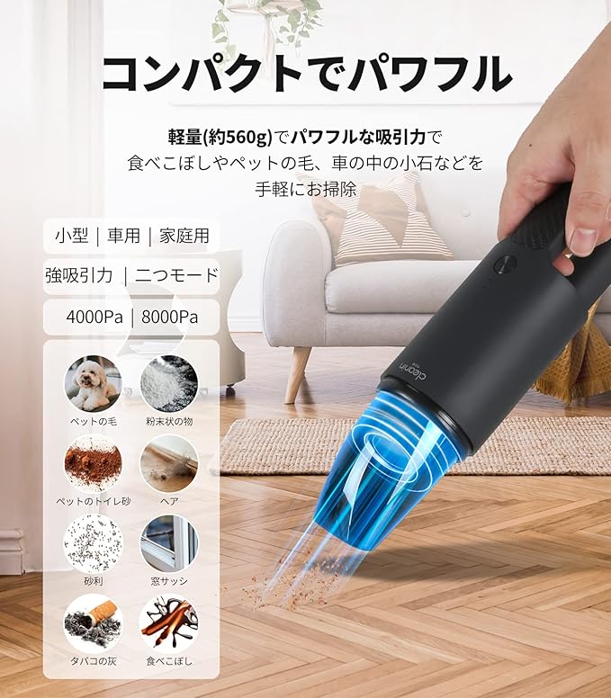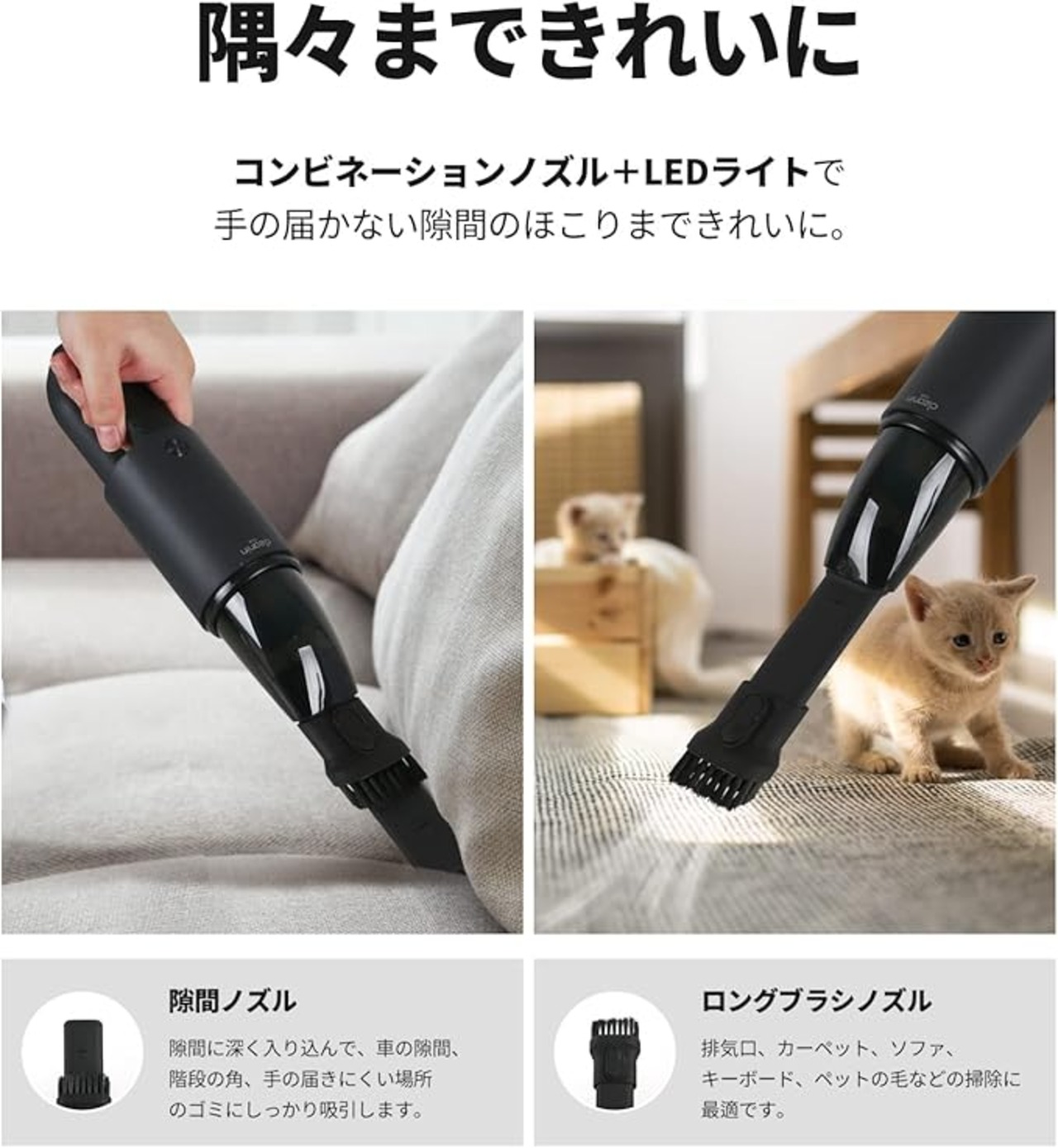 ハンディクリーナー Cleanin Nook 【コードレス/充電式/軽量設計/強力吸引/コンパクトサイズ/コンビネーションノズル付属】 ブラック