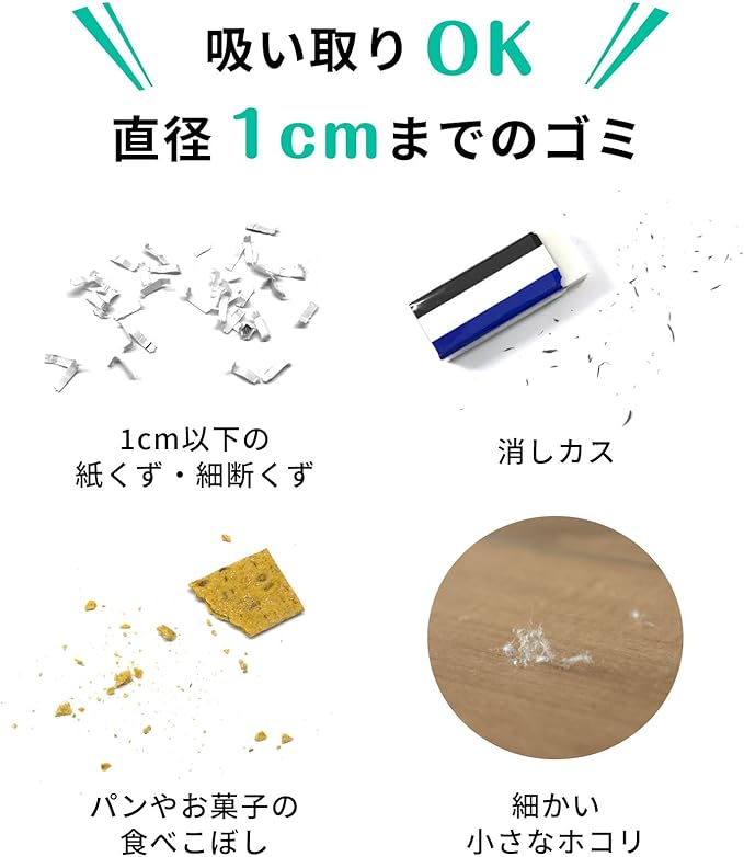 ●他にも、塵、えんぴつの削りかす、消しカス、髪の毛、キーボードの隙間のホコリ、座布団やイスの上のごみ等にも対応しております。