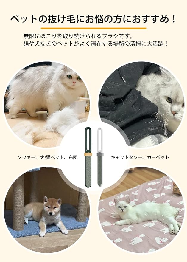【両面ブラシ】両面ブラシ設計どちらの面も使用できるので、より多くのほこりが取れます。片面ブラシの 2 倍の速さで毛や糸くずを取り除きます。無限にほこりを取り続けられるブラシです。猫や犬などのペットがよく滞在する場所(ソファー、犬/猫ベット、 キャットタワー、布団、カーペット)の清掃に大活躍!