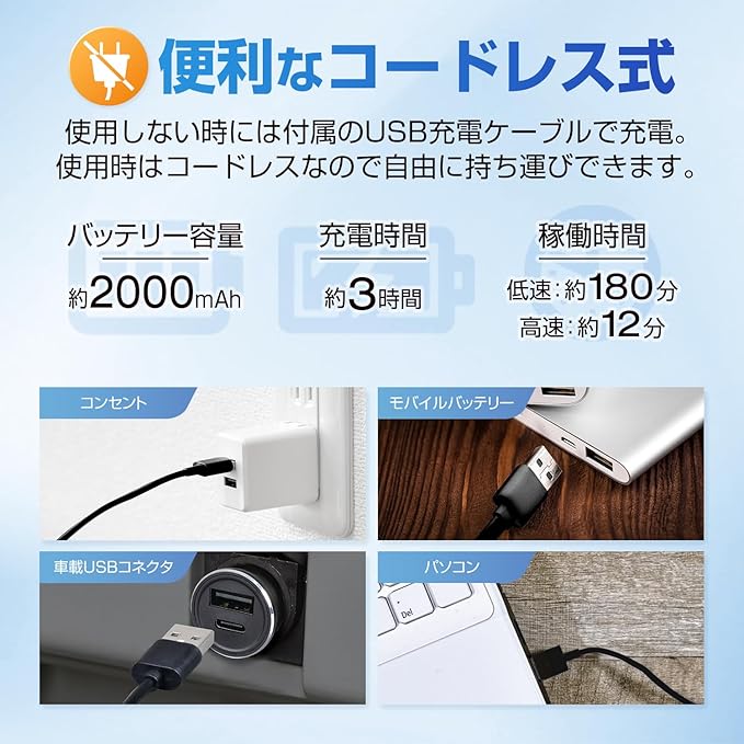 コードレスタイプ バッテリー容量2000mAh USB充電 フル充電時間 3時間