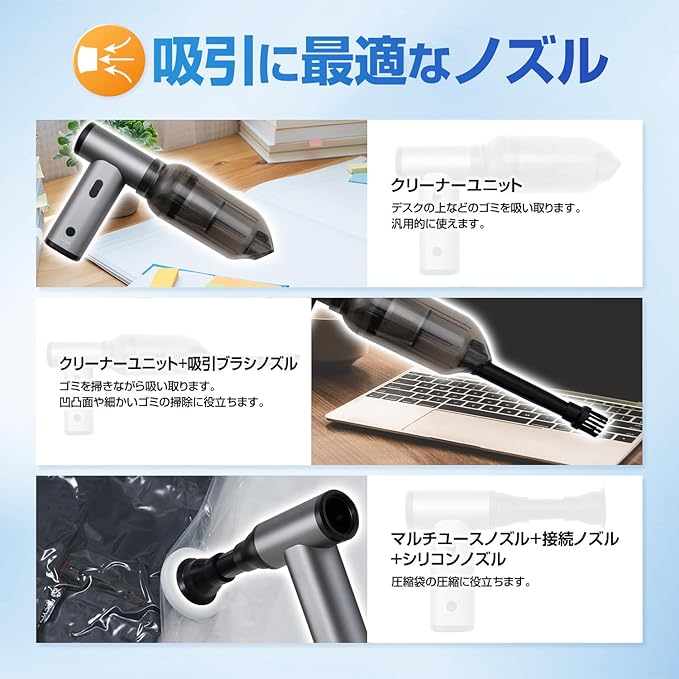 【様々な使用シーン】車内/ソファ/カーペット/キーボード/カメラ/リビング/ベッド/窓のサッシ/デスクなどの掃除に。空気入れやキャンプ時の火おこしの際に。布団や衣類の圧縮の際に。