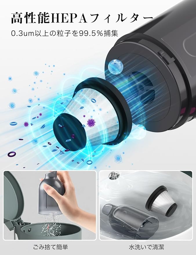 【高密度HEPAフィルター お手入れ簡単】ハンディ掃除機 はサイクロンィルターと多層の高密度HEPAフィルターを採用し、0.3um以上の粒子を99.5%捕集でき、一瞬にゴミを吸入。0.2Lの半透明ダストブックスでゴミを確認しやすく、ごみ捨ても簡単です。ダストブックスとフィルターを水洗いでしっかりと清潔して、頻繁に交換する必要がありません。LEDランプが付き、夜の暗いところまでも掃除しやすいです。