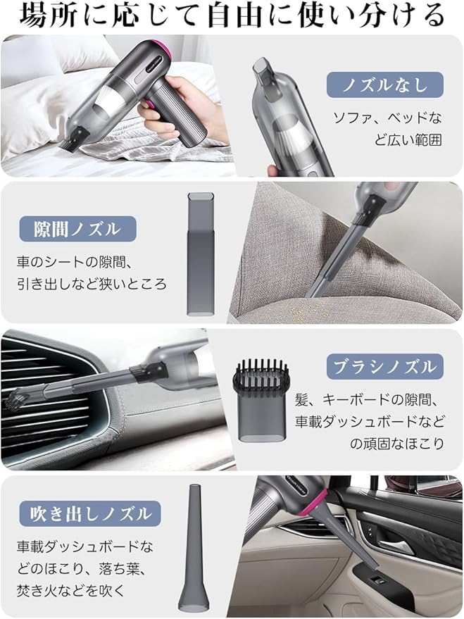【一台多役クリーナー 家庭用&車用掃除機】付け替えノズル六つが備えて、吹き飛ぶ、吸い込む、空気入れ、空気抜きなど異なる用途に使います。掃除機だけでなくエアダスターや電動エアーポンプやドライヤーとしても利用可能です。掃除機として、ソファの隙間、キーボード、ペットケア、車内掃除などの場所に使用可能です。空気入れ・抜き機能も付き、電動エアーポンプとして、浮き輪、ヨガボールなどの空気入れ、収納袋、衣類圧縮袋の真空引きにも使用可能です。ドライヤーとして使用もでき、衣類やペットの毛髪などを乾かすことも可能。