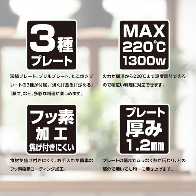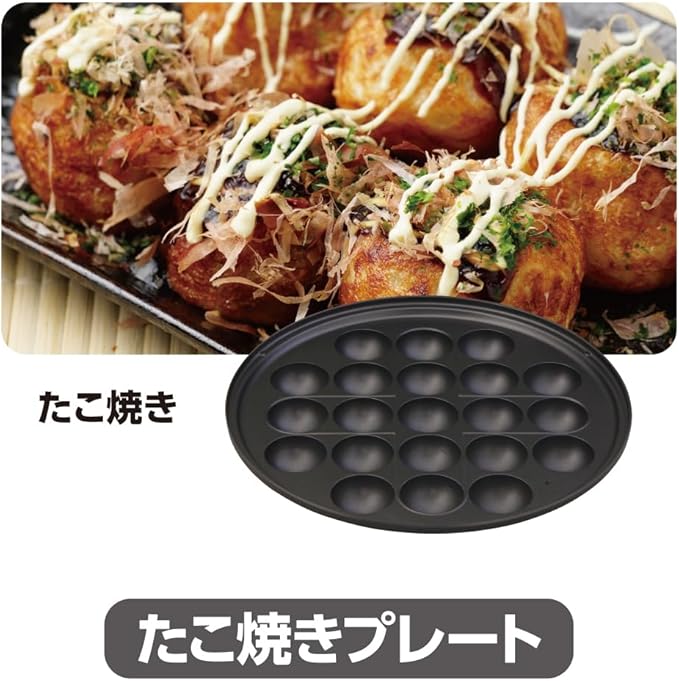 深鍋プレート、グリルプレート、たこ焼きプレートの3種が付属。