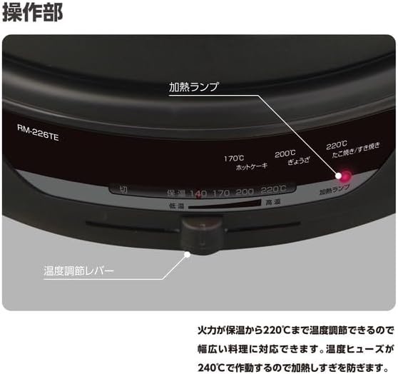 火力が保温から220度まで温度調節できるので幅広い料理に対応できます。温度ヒューズが240度で作動するので加熱しすぎを防ぎます。