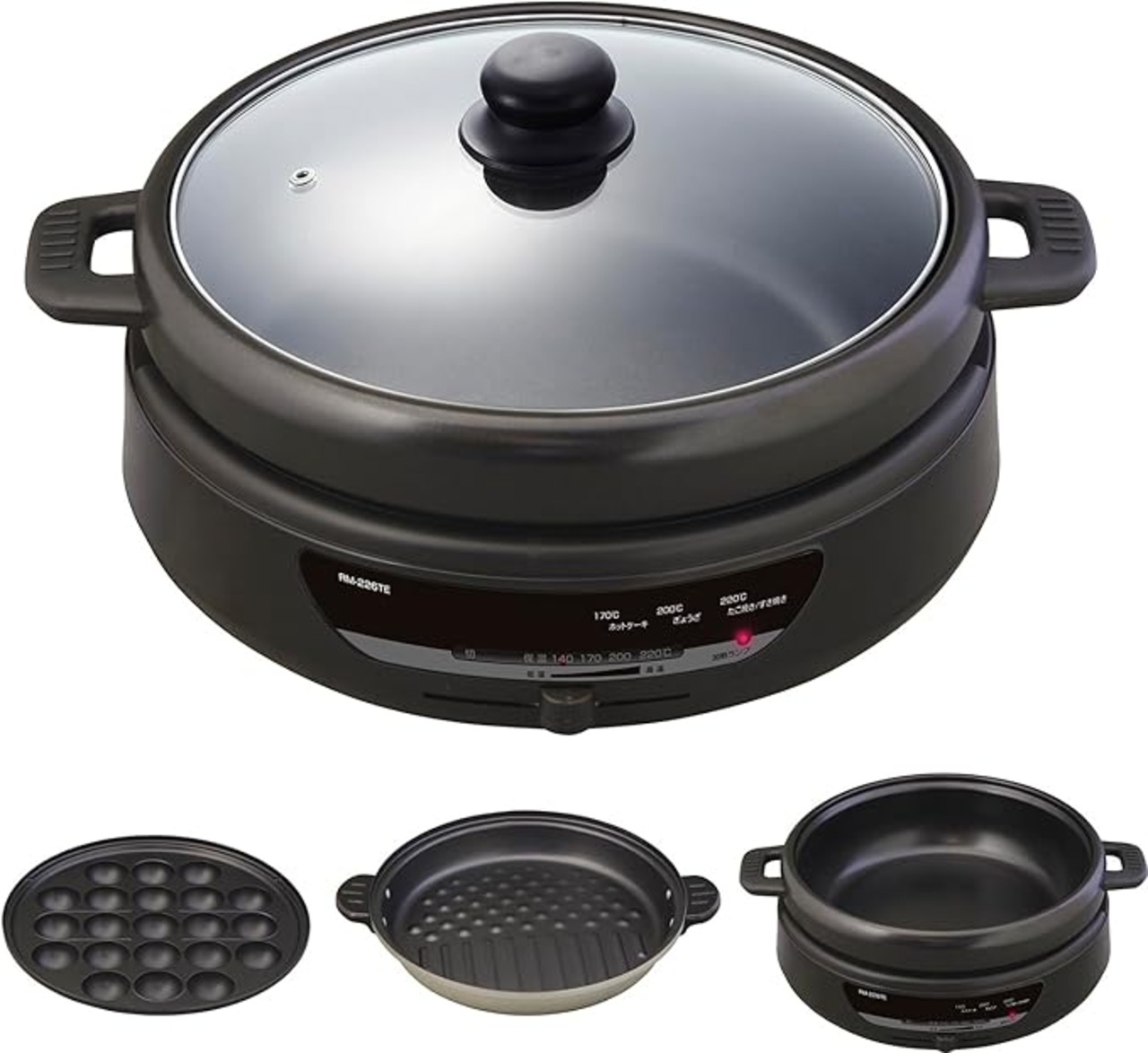 [大阪Deco] 3枚プレート 電気グリル 鍋 [たこ焼き・グリル・深鍋] フッ素加工 ガラス蓋 MAX220度 1300W 2~4人用 ホットプレート 電気鍋 [煮る 焼く 蒸す] 煮込み料理 おでん 湯どうふ しゃぶしゃぶ 水炊き すき焼き ホットケーキ ハンバーグ 餃子 たこ焼き 鉄板焼き