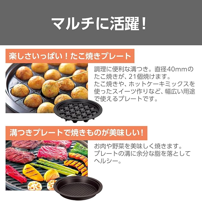 調理に便利な溝つき。直径40mmのたこ焼きが、21個焼けます。 たこ焼きや、ホットケーキミックスを使ったスイーツ作りなど、幅広い用途で使えるプレートです。