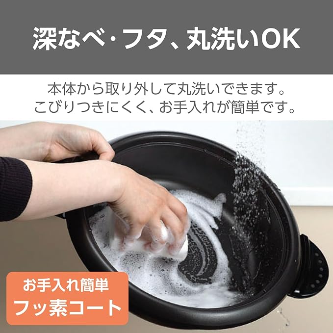 ■直接コンロにかけられるから下ごしらえもスピーディーに※。 容量たっぷり3.4Lの深なべは1台3役。煮る・焼く・蒸すの調理で、お鍋も楽しめます。 ※ 必ずだし汁やスープを入れた状態でご使用ください。IH調理器では使用できません。