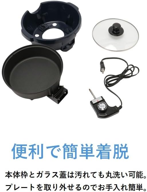 材質:本体ケース=ポリプロピレン、プレート=アルミニウム合金(フッ素樹脂加工)、蓋=強化ガラス、ツマミ=フェノール樹脂