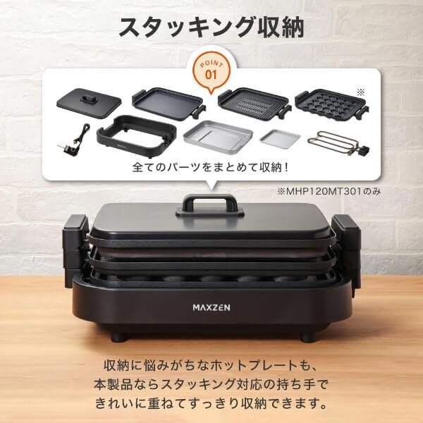 MAXZEN ホットプレート 鍋 焼肉 温度調整 プレート グリル鍋 お好み焼き 2枚 一人用 家族 減煙 丸洗い 電気プレート コンパクト ヒーター式 卓上 フタ付き 黒 MHP120MT201-BK マクスゼン