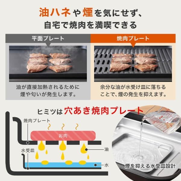 3つのプレートでレパートリーが広がる※お選びのモデルによってプレートの種類が異なります。 1.平面プレート:広いスペースで様々な料理に対応。 2.焼肉プレート:油落とし穴があり、美味しくヘルシーに。水受け皿付きで減煙効果も。 3.たこ焼きプレート:区切り線を目安に丸めてきれいに焼けます。