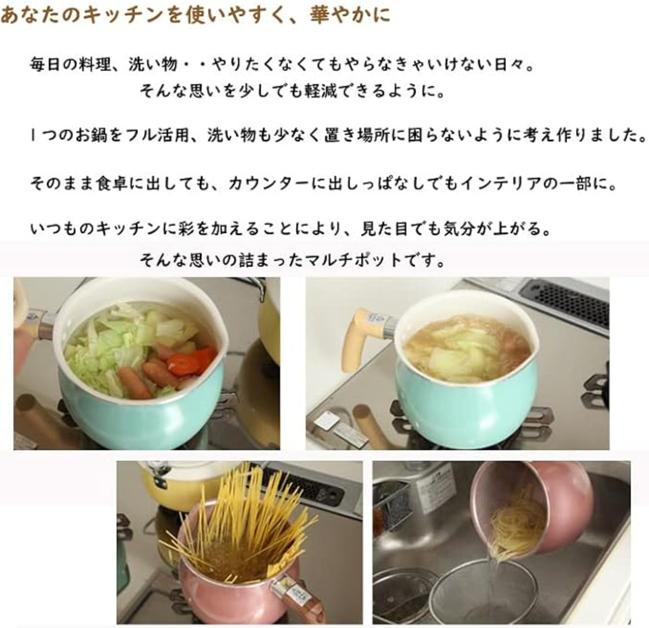 "[煮る/たっぷり煮込める2.5L]片手鍋と同じ要領で使えるから、煮込み料理やスープづくりに大活躍。カレー・シチューなど“具材を炒めてから煮る”メニューもフライパンいらず。1台で完結します。 [茹でる/具材の芯まで火が通る]食材を茹でることも得意なマルチポット。パスタやインスタントラーメンなどもおいしく作れます。" [炒める/深さがあって炒め物がしやすい]フライパンに比べて深さがあるので、具材が飛び散ることもなし。油も飛び散りにくいので、コンロ周りの後始末もラクチン。取っ手のようなハンドルで鍋ふりしやすいところもポイント。 [沸かす/アツアツのドリンクをそのまま注げる]ミルクを温めたり、茶葉を煮出したり…注ぎ口付きだから水切れもスムーズ。レトルト調理の温めもOK!