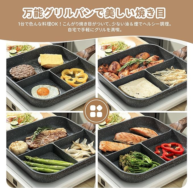 【3つの仕切り&美しい焼き目】仕切りで味移りせず同時調理。波型グリル部分が余分な油を落とし、美しい焼き目をつけます。円形くぼみはハンバーガーや目玉焼きに最適です。