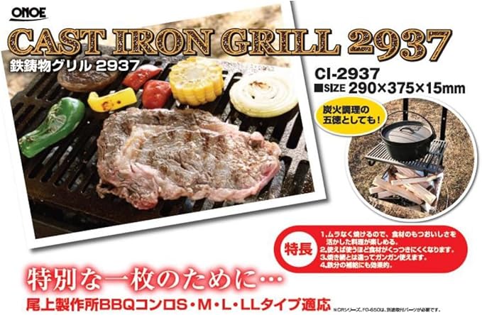 尾上製作所(ONOE) 鉄鋳物こんろ角型(鋳物グリル2937) バーベキューコンロ キャンプ 熱伝導で食材の旨みを芯から引き出す