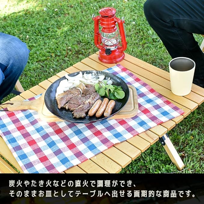 ハンド無骨で実用性のあるシンプルなデザインだから使いやすいルでお皿をつかみ、フライパンとして直火で焼ける