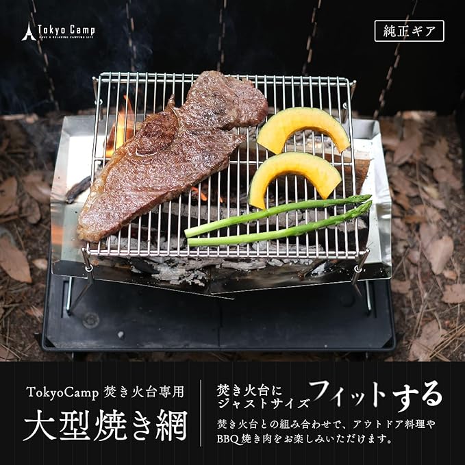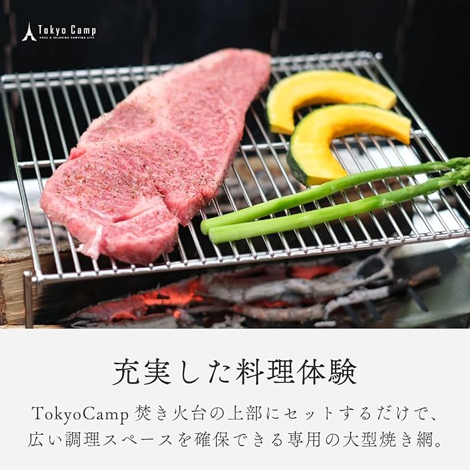【 大型網 +OPセット 】 Tokyo Camp 焚き火台 専用の 大型 焼き網 と オプションパーツ のセットになります。 TokyoCamp 焚き火台 と併用していただくことで、より幅広い 焚火 飯料理やバーベキュー、焼き肉といった所までお楽しみいただけるようになります。 焼き網 は 焚火台 のフレームに引っ掛かるように設計されており、だれでも簡単に設置することができます。