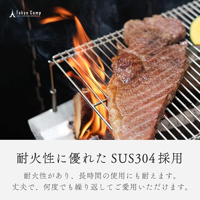 【 ステンレス 製 】 焼き網 には ステンレス スチール(SUS304)を採用。耐久性に優れ、火による酸化や腐食が発生しにくく、より長くお使いいただけます.