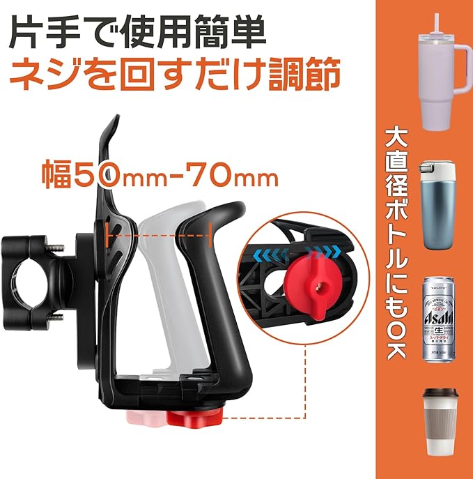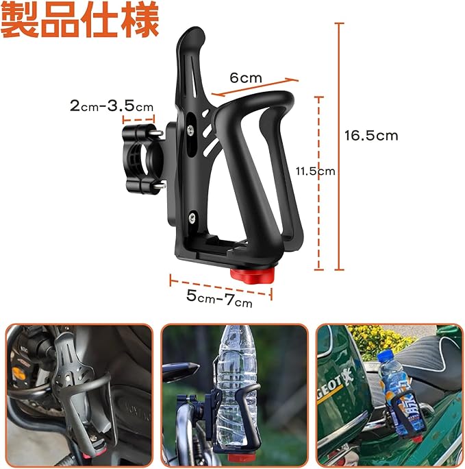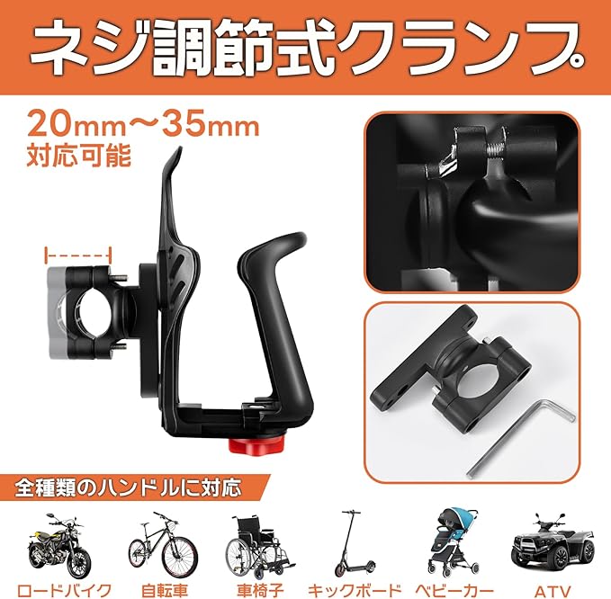 【幅広い汎用性】バイク用ドリンクホルダーの固定クランプは20㎜~35㎜に調節でき、全種類のハンドルに対応できます。バイクと自転車はもちろん、車椅子、ベビーカー、キックボード、ATV、UTV用にも最適です。 長距離ライド、サイクリング、街乗り、ベービーケア、老人介護などに理想的なボトルホルダーです。