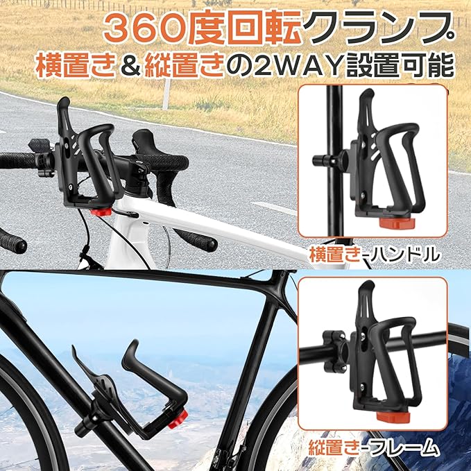 【2025年最新版ドリンクホルダー】ドリンクホルダーでボトルを車体に装着し、いつでも片手で簡単にサイクリング中の水分補給を快適にするボトルホルダー。車体にしっかり装着できるので、片手で簡単にドリンクを取り出せます。ロングツーリングから日常的な街乗りまで、あらゆるシーンで活躍。360度回転式のユニバーサルデザインで、どんなハンドル角度にもフィットします。横向きに取り付ければフレーム設置も可能です。