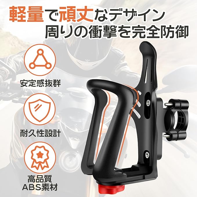 【驚異の安定性】高強度ABS樹脂製のボディは、軽量でありながら衝撃に強いシールド構造。金属製クランプが車体にガッチリ固定するため、荒れた山道でもズレ落ちる心配がありません。プロライダーも認める抜群の耐久性です。