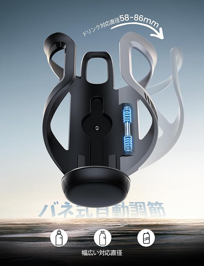 ️【バネ式・自動調整】ドリンクをしっかりと固定するためにバネ式ホルダーを設計された。ドリンクの太さに合わせて自動調節できて、デコボコな道でもたらす振動でも落下の恐れがある心配もなし。ボトルホルダーの可動範囲は58mm—86mmで、ワイドな調整直径なので、350ml缶や500mlペットボトルなど多種のドリンクに対応できます。(ご注意:自動調節ホルダーはボトルをしっかり固定するため、きつくなってしまい、柄のついたボトルの表面に傷がつくことがあります。)