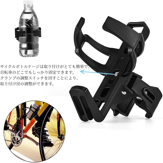【商品情報】 商品名:自転車ドリンクホルダー セット内容:自転車ボトルケージx2 重さ:約200g サイズ:約14.5 14.5cm 対応ボトルサイズ:直径約6.35-8.4cm ブラケット開口:直径約1.5-4.3cm 材質:PC カラー:ブラック 【耐久性抜群】 高弾性PC素材。軽量で十分な強度があり、使い心地が良く、耐久性と軽さを兼ね備えます! 【360度回転設計】 ボトルケージは自転車や乳母車バギーなどの車のタイプに合わせて、360度回転可能の設計により、任意の角度に調整できます。 クランプの調整スイッチを回すことで直径を調整・固定します。 【安全設計】 クランプの調整スイッチを回すことにより、取り付け径の調整ができます。クリップ式で自転車を傷つけません。お子さまがはずしにくいベビーカー専用、安全設計のカップホルダーです。 【高汎用性】 ほとんどのウォーターボトルに対応できるため、さまざまな形状のウォーターボトルを安全に持ち運ぶことができます。自転車のハンドルバーに簡単に取り付けるボトルホルダーです。それに自転車にどこでもクランプでしっかり固定できるドリンクホルダーです。