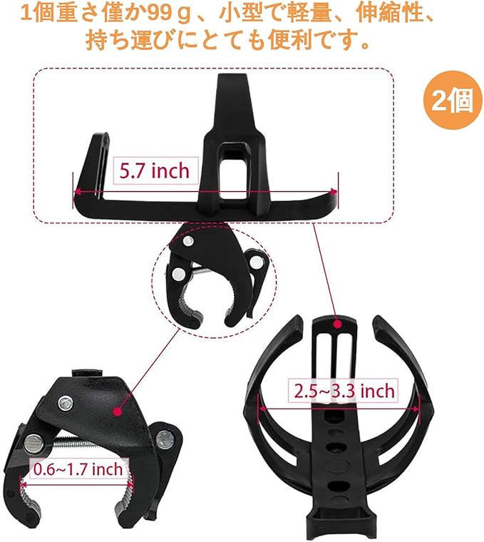 【商品仕様】:自転車ボトルホルダーの全長は14.5cm、ドリンクホルダー直径は63.5〜84mm;クランプ:直径約15~43mm調節可能。重さ僅か99g、小型で軽量、持ち運びにとても便利です。