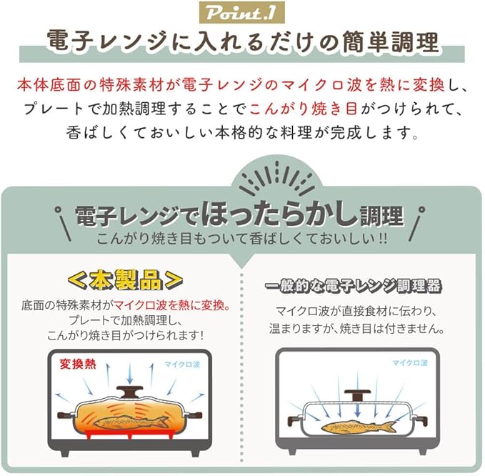 【電子レンジに入れるだけ!】 焼く、炒める、蒸す、茹でる、炊く、煮るなどの調理がこれ一台で。 本体底面の特殊素材が電子レンジのマイクロ波を熱に変換し、プレートで加熱調理することで、 食材にこんがり焼き目がつけられて、香ばしくておいしい本格的な料理が完成します。