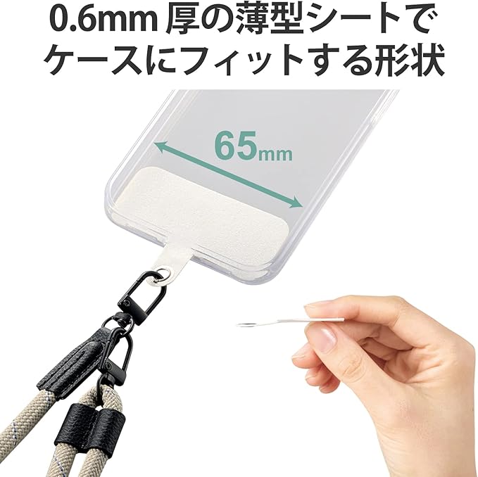 ■スマートフォンとケースの間に挟むだけでストラップホールを追加できる、1口タイプのストラップホールシートです。