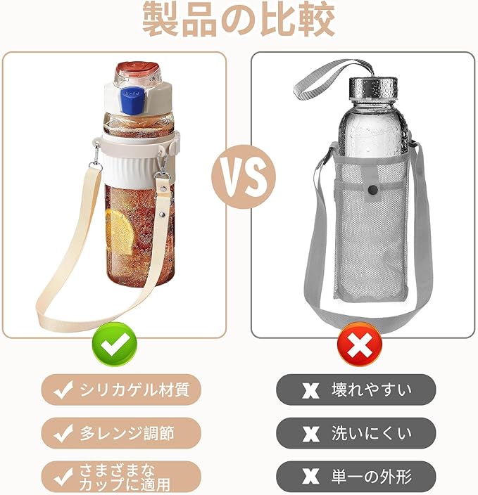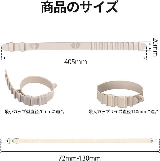 【ほとんどのカップにフィット】この調節可能な水筒ストラップは、小さいものから7cmまで、大きいものから11cmまでのカップサイズにフィットします。魔法びんだけでなく、丸型や角型など様々な形状の水筒や飲料容器にも対応し、適用範囲が広く適応力が強いです。その多用途性により、アウトドアアクティビティの必需品となります。