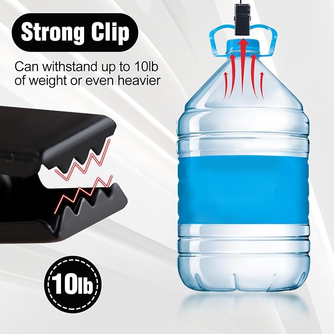 【吊り下げ用の頑丈なクリップ】ワニ歯状の滑りにくいデザインで、布やロープなどの吊り下げ物をクリップにしっかりと固定します。最大10ポンド(約1.5kg)の重さまで支えることができます。