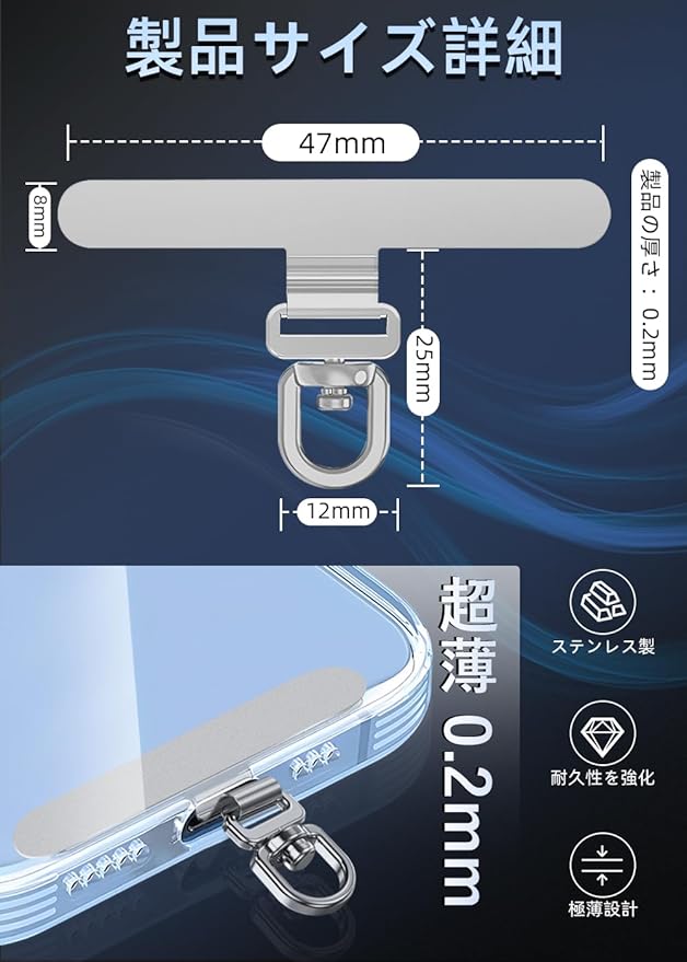 【薄型設計0.2mm】このスマホストラップホルダーは、業界最薄の0.2mmの厚さを実現。スマホケースに挟んでも浮き上がらず、ケーブル充電やワイヤレス充電にも干渉しません。防水性能があり、汚れや埃は簡単に拭き取れます,快適な使用感を提供します。全体が高品質なステンレス製で、耐久性に優れ、長時間使用しても錆びにくい。表面にはメッキ仕上げが施され、高級感を演出します。