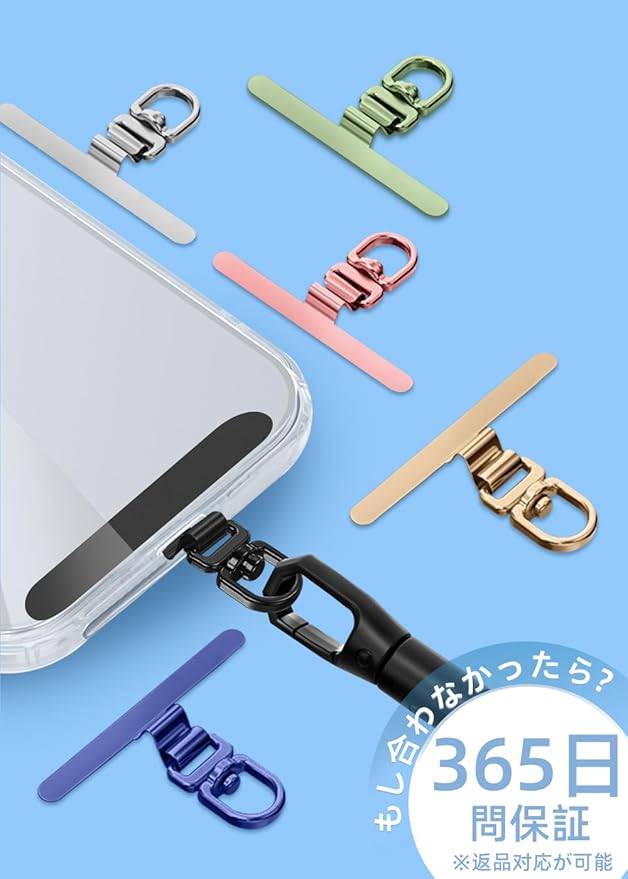 【装着簡単・充電に干渉しない】ケースとスマホの間にタグパッチを挟むだけで簡単に装着可能。ストラップホールが外付けされており、ネックストラップやハンドストラップをお好みで取り付けられます。
