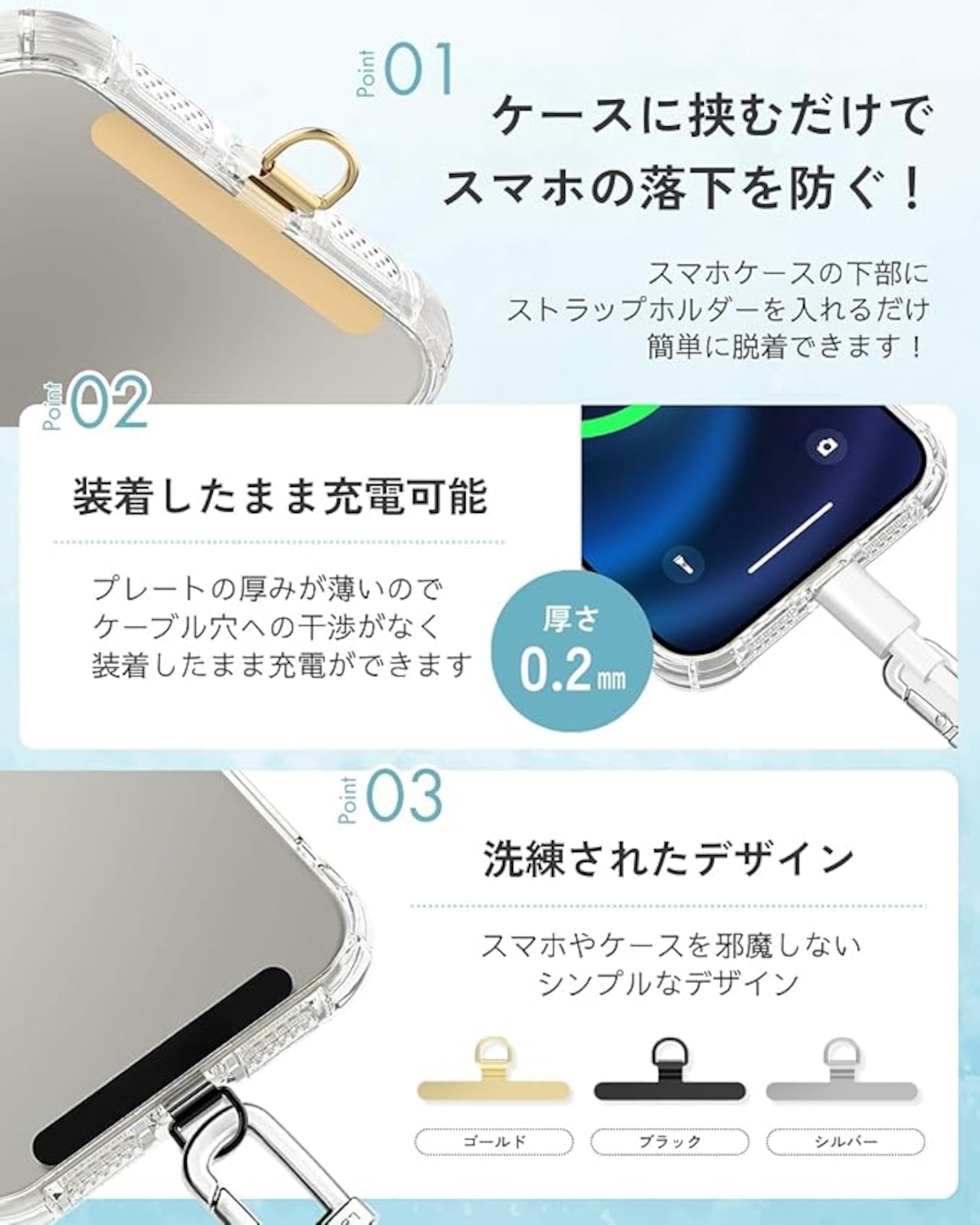 [LICOM] 【ちぎれるストレスから解放】 スマホ ストラップホルダー 極薄0.2mm 金属製 タグパッチ 落下防止 充電影響なし 首掛け 斜めがけ 全機種対応 (ブラック)