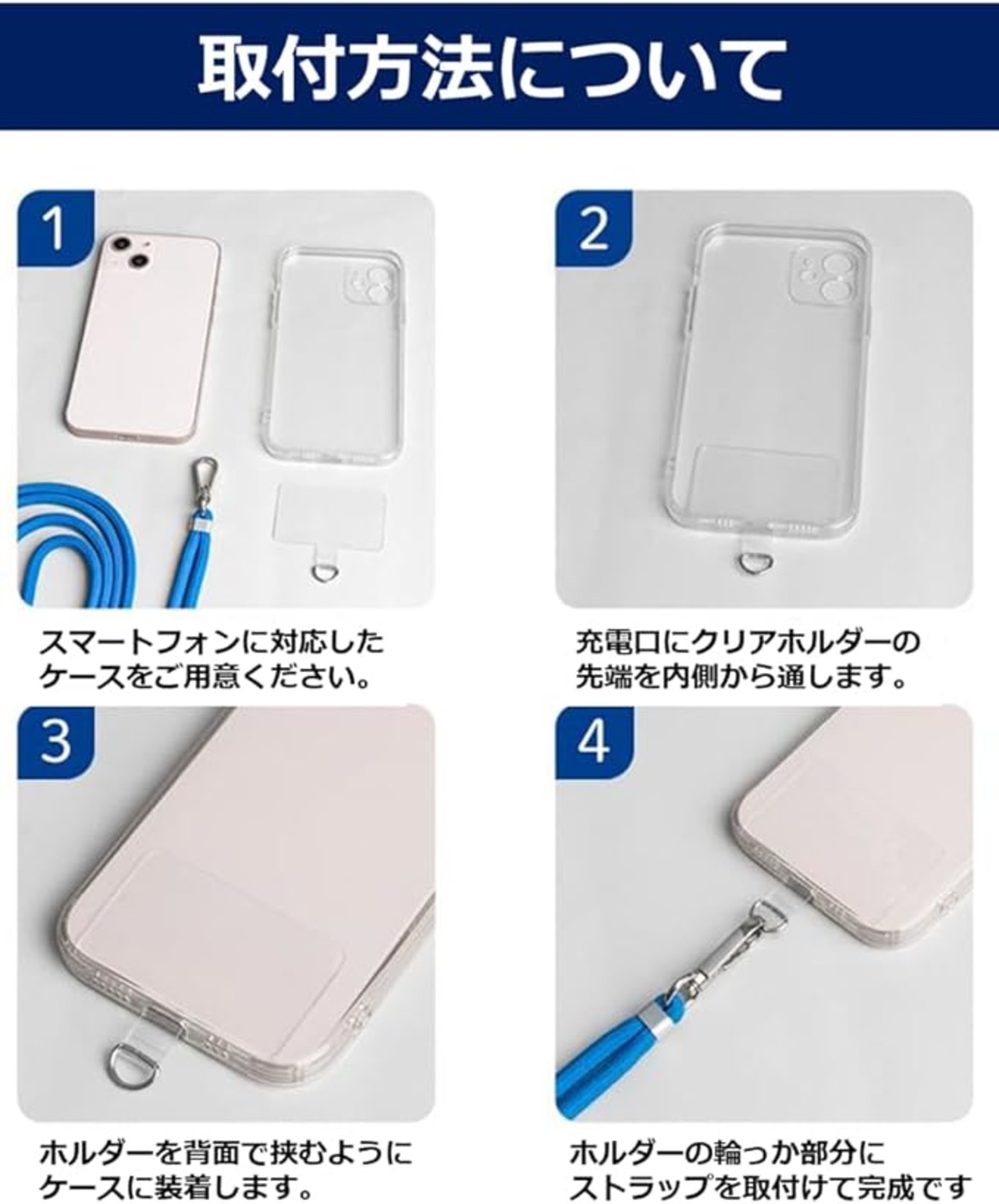 【装着簡単・充電に干渉しない】タグパッチをケースとスマホの間に挟んで、ストラップホールが外付けなので、自分好みに合わせて、ネックストラップやハンドストラップに装着できます。透明の特徴を備えて、装着しても何もつけないような薄型がデザインされます。わずか0.6mmの薄さで、ケーブル/ワイヤレス充電に邪魔しません。防水効果があり、埃や汚れになる場合には簡単に拭き取ります。
