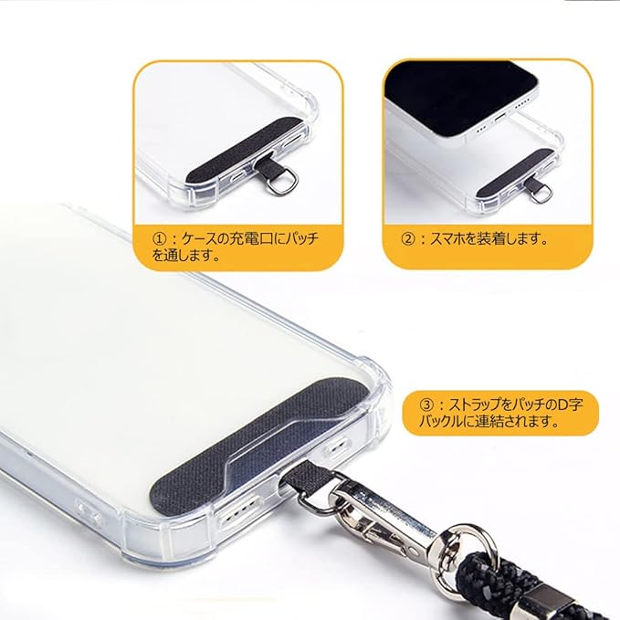 【装着・脱着簡単】:①:タグパッチをケースの充電用ホールに差し込み;②ケースにスマホを装着してください。③ご好きなストラップを掛けてください。ストラップホルダーは粘着式でなく、ケースに貼り付けないので、ケースが汚れずいつでも付け外しできます。(ストラップはこのパッケージに含まれておりません。)