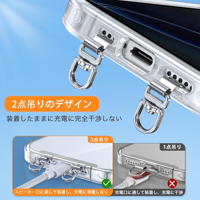 【2口タイプ、充電に完全干渉ない】: 従来の製品は1つの掛けリングを搭載して、充電口に通して装着するから、充電に干渉しやすいです。本製品は2つの掛けリングをデザインされて、ケースのスピーカー口に通して装着し、充電ケーブルの接続を完全に邪魔しなくて、シールを挟んだままでも充電やイヤホンのケーブルを挿すことができます。