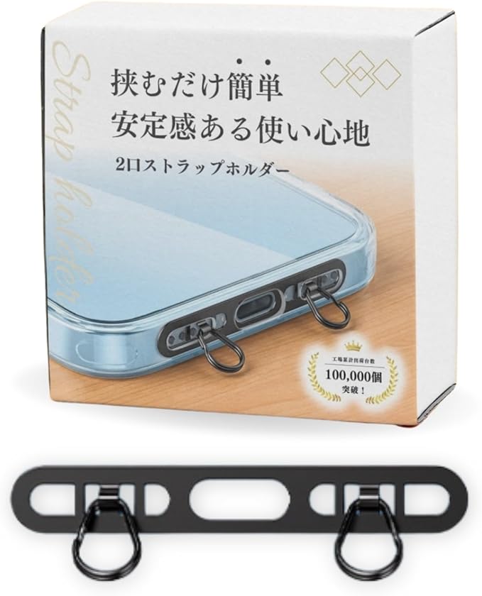 【挟むだけ簡単】スマホ ストラップホルダー 2口タイプ ダブルリング 極薄0.3mm ステンレス製 薄型 丈夫 充電影響なし 落下紛失防止 全機種対応 [LICOM] (ブラック-TQ)