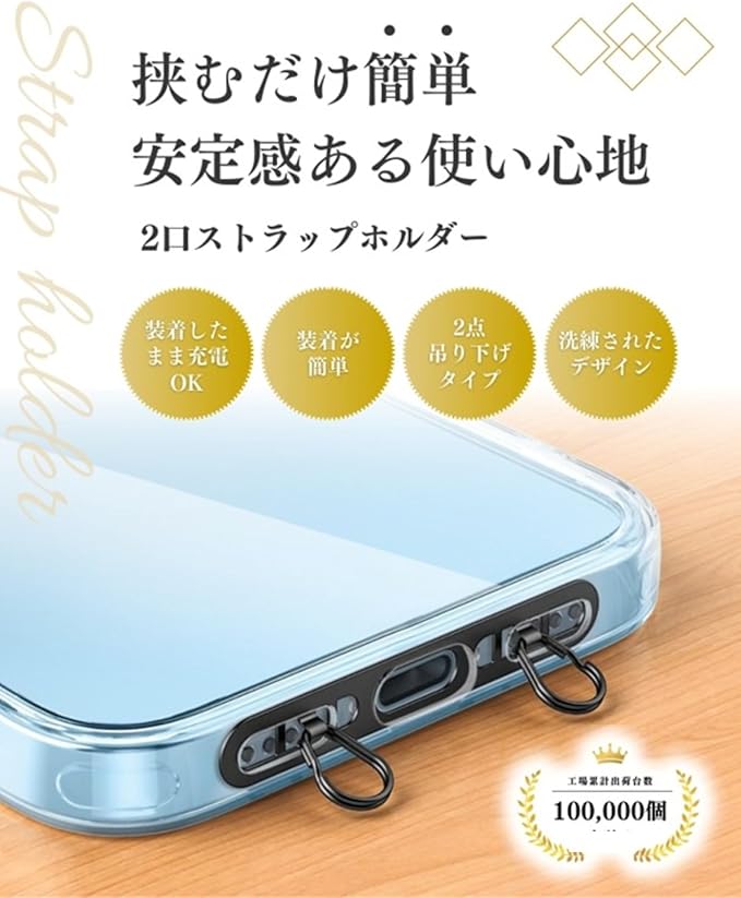 【ダブルリングの2点吊り設計】スマートフォンを2点で支えることで、回転を防ぎ安定感抜群。リストストラップやショルダーストラップと組み合わせて快適に使用できます。
