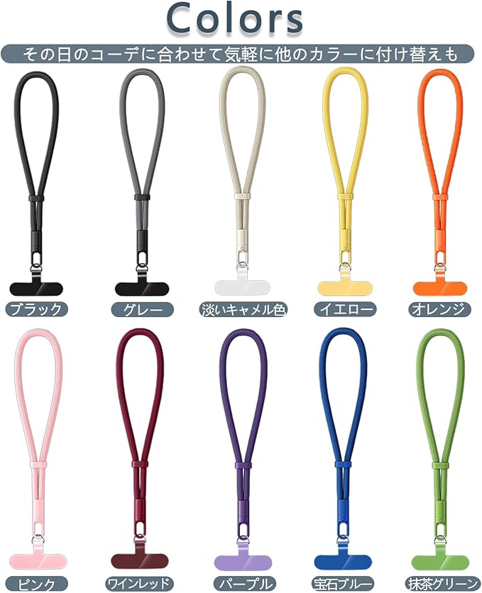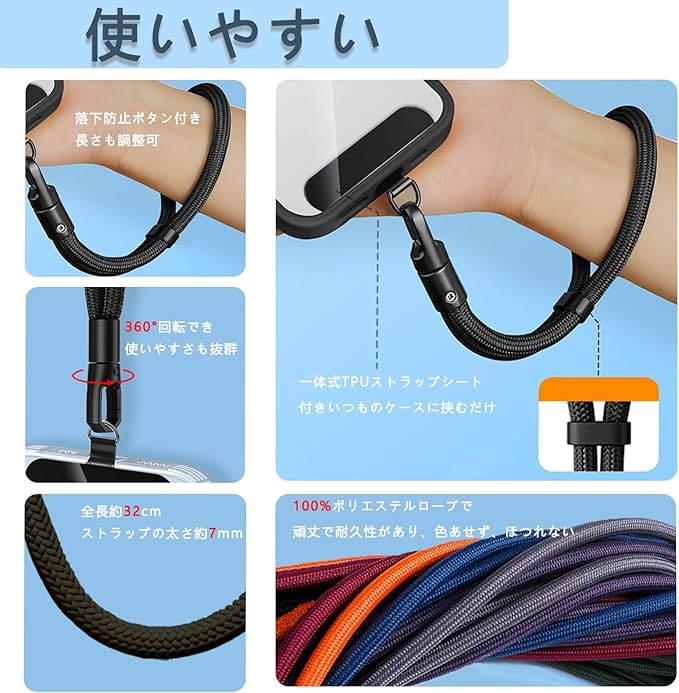 【使いやすい】全長約32cm、ストラップの太さ約7mm;調節ボタン付きでハンドストラップの長さを調整可能です。360 回転し、使いやすさも抜群です。さらに、手触りが柔らかく重量は24gで手首に負担になりません。