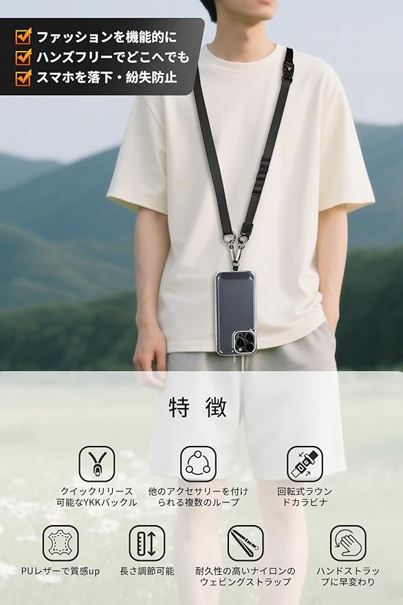 ✅【✨サイズ✨】:幅1.5cm 着用長さ45cm~75cm (金具含む)【✨内容物✨】: ストラップ 1本 、ストラップカードカード2枚、カラビナ 1枚、ストラップひも4枚(根付が付いているのでスマホやカメラの本体などのナスカンで付けられない部分にも付けられます)。
