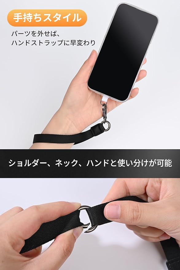 ✅【✨特徵6✨】:2段式のデザインなので、パーツを外せばハンドストラップに早変わり。パーツを外せば、肩掛けストラップスと手首ひも、両方同時に使用することができます。