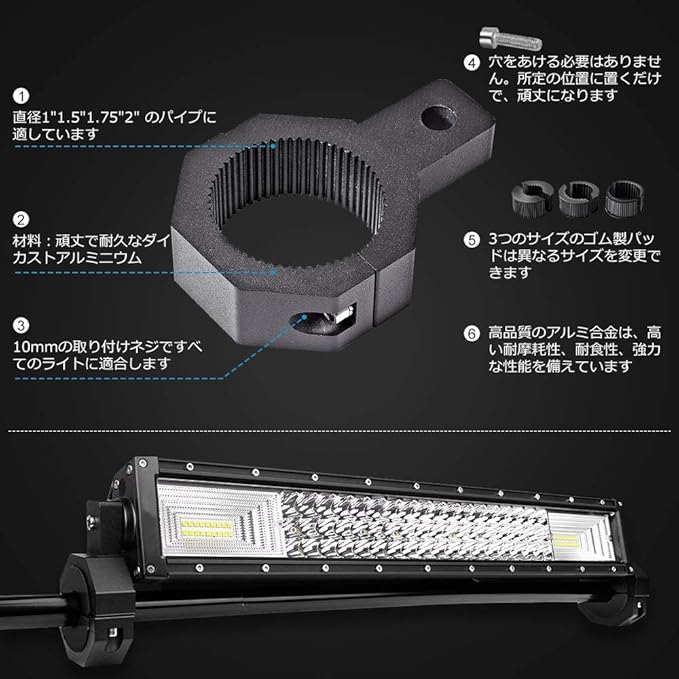 【適用範囲】汎用(25-50mm径パイプに挟み込むことが可能です) オートバイのバンパー等のパイプにLED作業灯・バーライト・フォグランプ・サーチライト・デッキライトなどを取り付けためのスタンドとしてお使いいただけます。