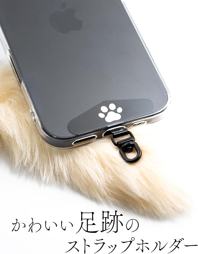 つや消しマットブラックのプレートに可愛い足跡(肉球)がシルバーで刻印されたスマホストラップ用のストラップホールシート。お手持ちのスマホケースの中に入れるだけでストラップを取り付けることができます。