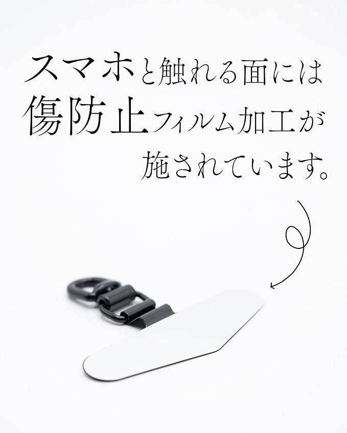 ちぎれない丈夫なステンレス製。約3gという軽量で負担になりません。薄さは約0.4mmでスマホの浮きを抑えながらも、丈夫さを兼ね備えたバランスです。
