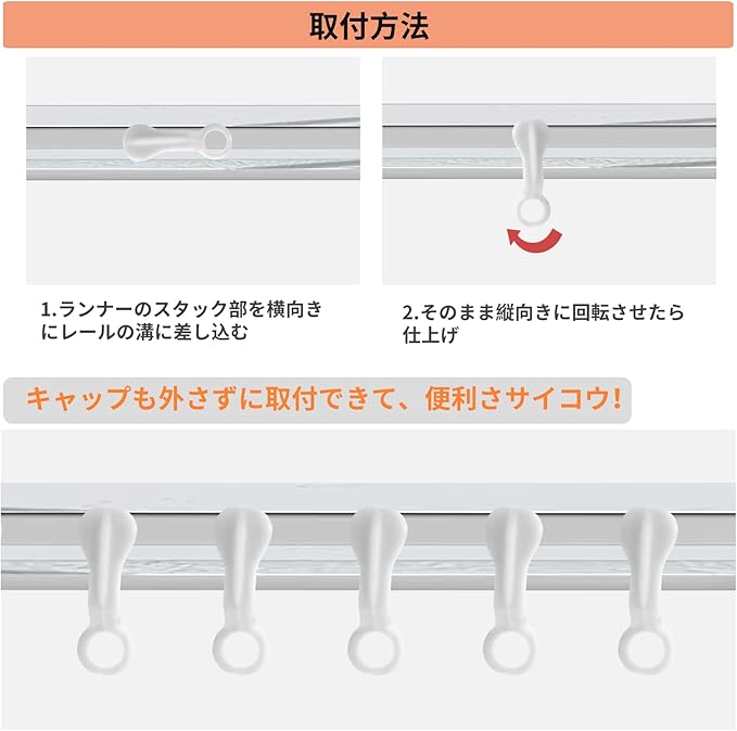 ★【取付簡単】ステップ1:カーテンランナーのスライダー部を横向きにレールの溝に差し込みます。ステップ2:そのまま縦向きに回転させたら仕上げです。☆回転するときにランナーが溝に交渉可能の幅4.5MMから3.5MMへ変換します。つまり、スライダー幅4.5MMのところを溝に差し込めれば、そのあと回転させる際にサイズが合わないことはなし!