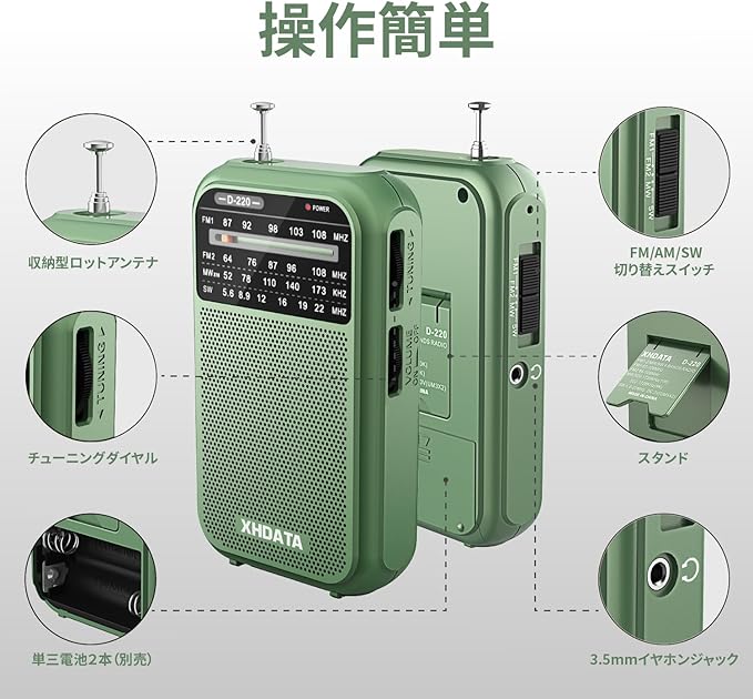 「単三電池使用」XHDATA D220携帯ラジオは単三電池2本を使用します。普通の音量で長時間を使用できます。簡単に交換できる電池型で、交換用電池を備えば、停電や外出に電源切れを心配いりません。(電池は別売で、付属されていないのでご注意ください。)